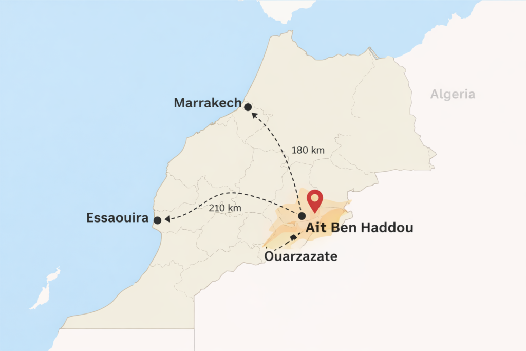 Aït Ben Haddou ligger i det sydlige Marokko, omkring 30 km fra Ouarzazate, på kanten af de høje Atlas-bjerge. Dens strategiske placering gjorde den engang til et vigtigt stop for handlende, der rejste mellem Sahara og de kejserlige byer.